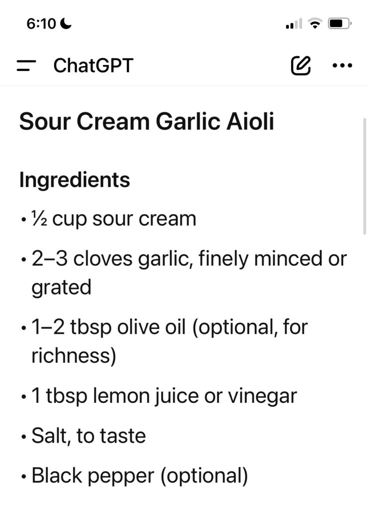 An amazing Chat Gpt recipe we have on repeat- sour cream aioli