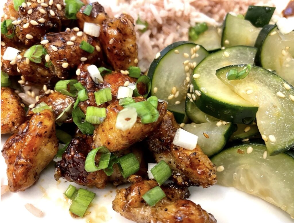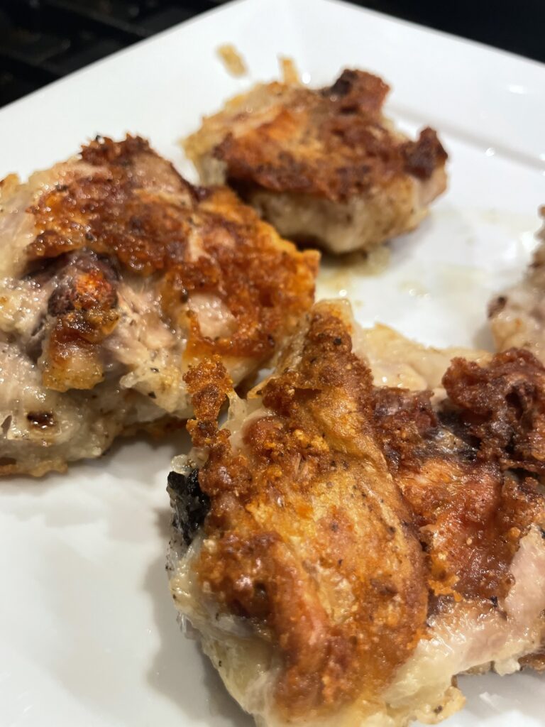 I don’t say something is “the best” very lightly! I found this amazing recipe on tik tok with 447.3k likes and it does NOT disappoint! The only thing I do different is I use this vegan oyster sauce (I’m allergic to shellfish and this is the best tasting vegan version I’ve tried), I salt and pepper to taste instead of use the salt quantities he recommends (too salty for my taste) and I use bone in chicken thighs so I get that yummy crispy skin. See below!