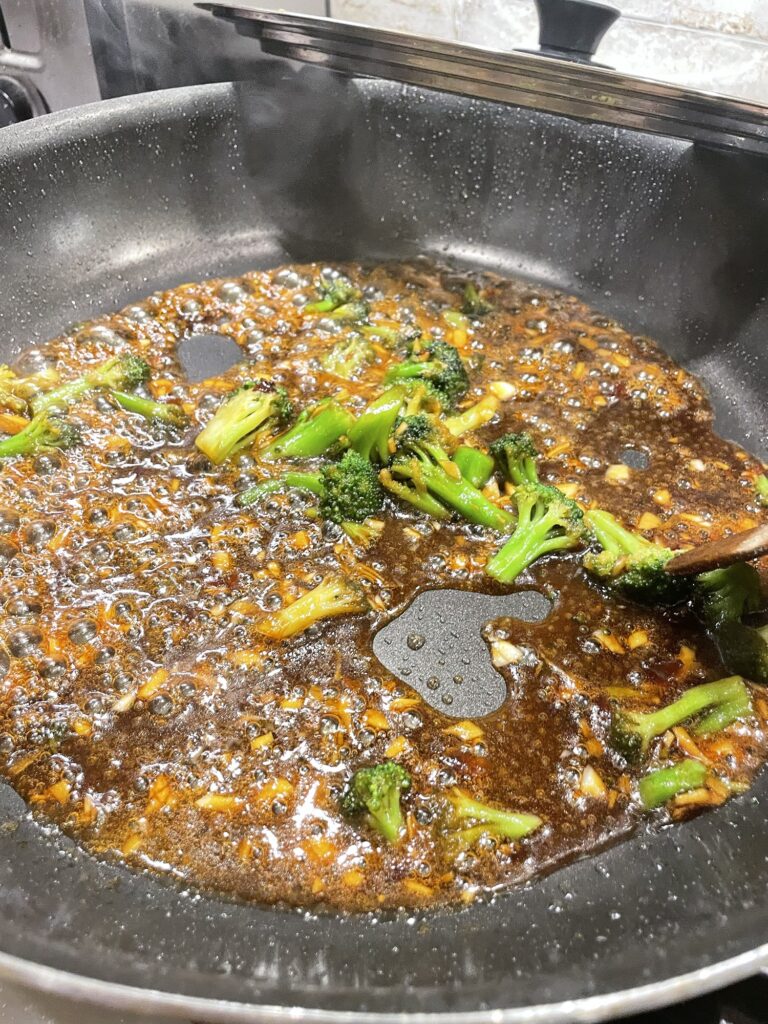 Also, I’ll add some broccoli since I’m an adult and don’t eat a meal without a fruit or vegetable. 🤣Look how the sauce caramelizes.