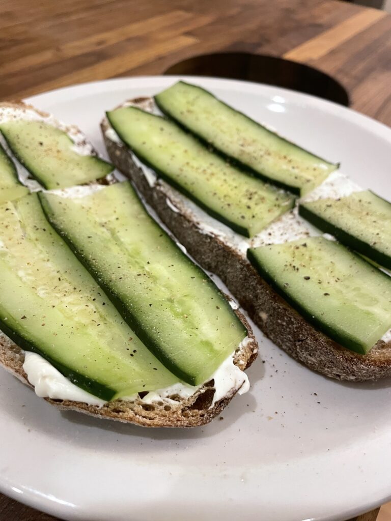 When nothing looks good and I don’t feel like eating, this has saved the day! Literally just crusty bread, cream cheese, sliced cucumber, and freshly ground salt and pepper. Have you ever had this??