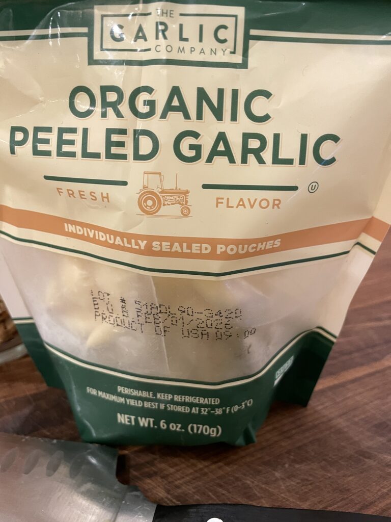 Anyways, back to garlic. I’ve stored garlic different ways over the years that were not ways I’d recommend. Cut up and pre minced garlic in a bottle never tasted as good as fresh, and fresh garlic in the bulbs would end up growing stalks and shriveling up. Also no bueno. So Allan suggested buying garlic raw but pre peeled and freezing it!