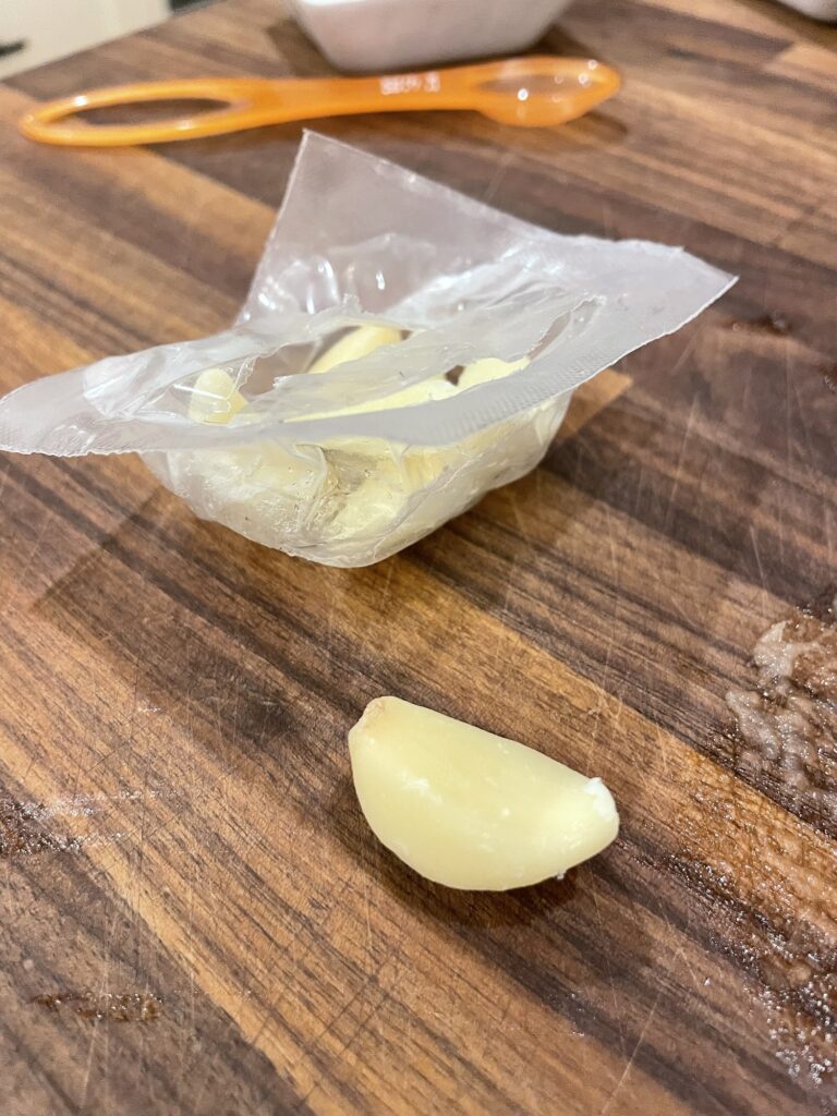 I am obsessed because unbeknownst to me, when you take out frozen and peeled garlic from the freezer, it dethaws on its own in less than a minute, I swear! After a minute, you can take a chef’s knife and it’s soft enough to smash into a buttery paste.