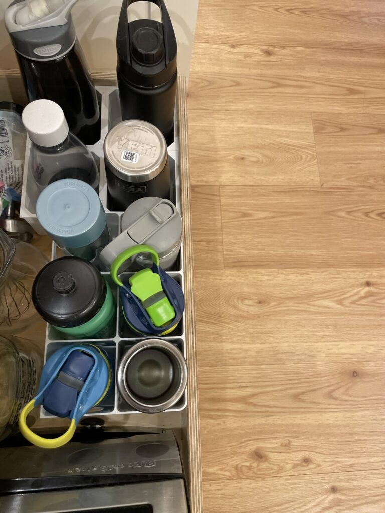We also had no good solution for water bottles, so Nate printed out two different sizes to organize these. His point again!