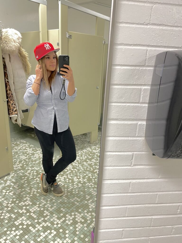 This outfit was inspired by her- a crisp collared button down (office) and a red flat cap + Nike sneaks (athleisure). I’m also wearing my new fleeced lined leggings I wax poetic about below.