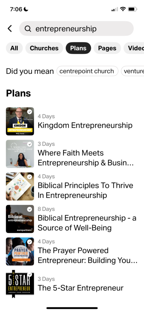 If you’re a Christian in business, I highly recommend searching the Bible app for plans under the word “entrepreneurship.” I’m currently going through all of them! It will look like this –